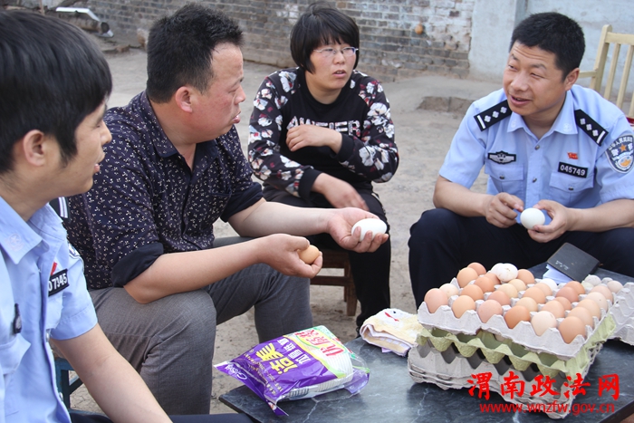富平县公安局在包村精准扶贫工作中,积极发挥公安机关业务优势,将法治教育宣传纳入精准扶贫范畴,民警深入田间地头村组院落向群众开展法律宣传教育服务活动推进法律扶贫。图为5月10日,美原派出所民警正在走访辖区一从事养殖生产的群众夫妻,并向他们进行防盗防诈骗等安全防范知识宣传。特约通讯员 刘苍锋 摄