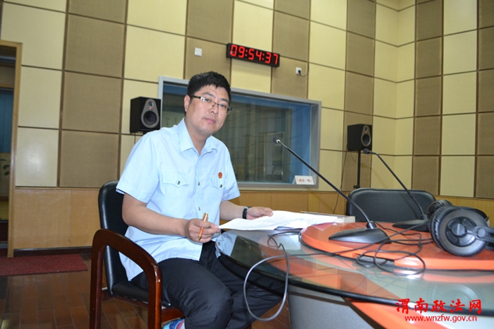 渭南政法网(特约通讯员 张晓峰 惠国强)5月19日上午,蒲城县人民法院副院长原广平、兴镇人民法庭庭长张晓峰应邀走进渭南人民广播电台《环境热线》栏目播音室,结合真实案例回答了主持人的相关法律问题,对群众关心的话题通过热线与听众进行了沟通交流。
