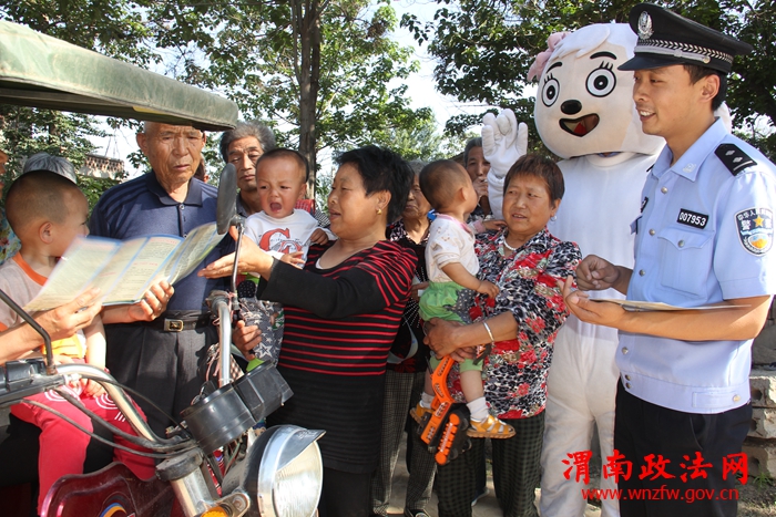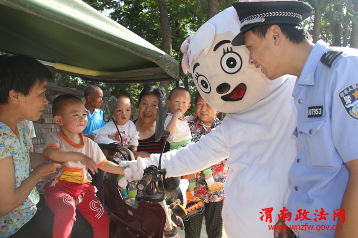 图为5月24日,张桥派出所民警带着机灵勇敢、足智多谋的喜羊羊在辖区甘井村向群众传授防拐卖知识。
