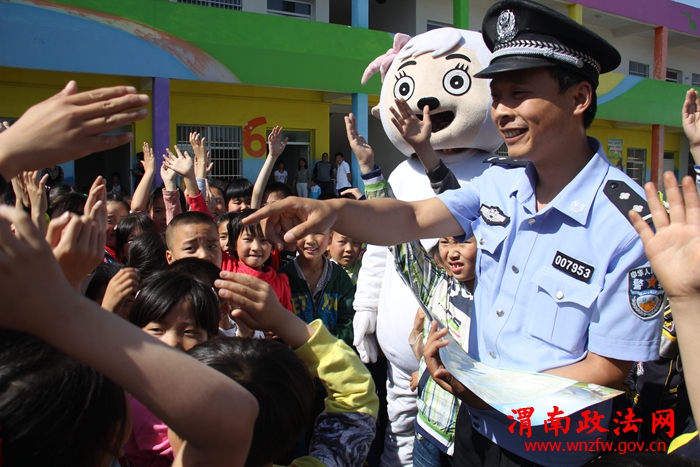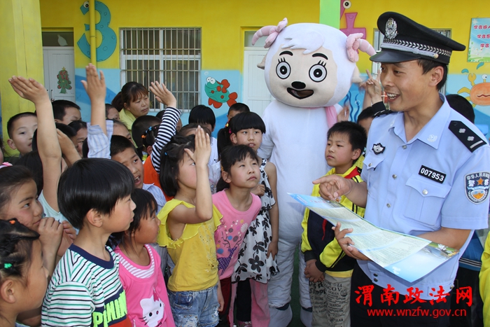 图为5月24日,张桥派出所民警带着机灵勇敢、足智多谋的喜羊羊向辖区幼儿园小朋友传授防拐骗知识。