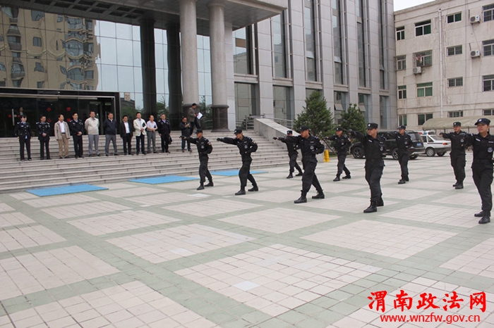 刘力总队长一行首先在该院办公楼前观摩了司法警察大队技能表演。伴随着指挥员口令,“全体队员都有,擒敌拳准备格斗——开始”,只见场上的法警们统一着装、精神抖擞、气势高涨、动作整齐划一、口号响亮,向法警同仁展示了擒敌拳、格斗等训练课目,赢得了观摩领导的阵阵掌声。随后,在王玉琦院长的陪同下观看了蒲城法院司法警察大队法警工作宣传展板、办公室、值班室等。