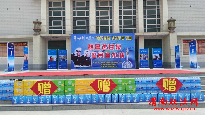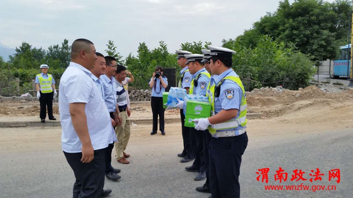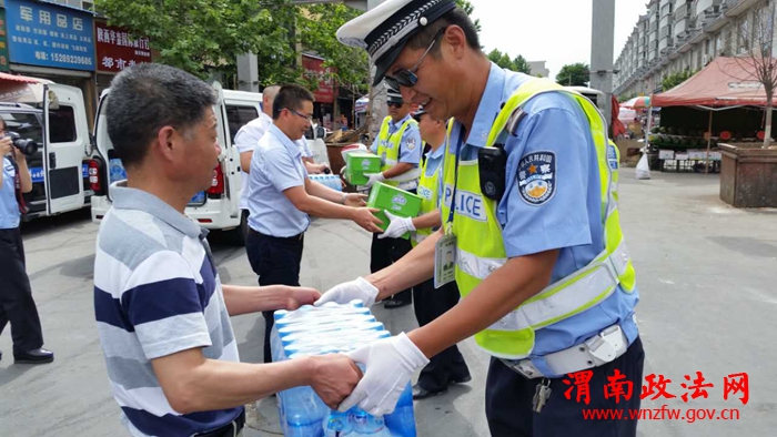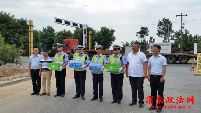 渭南政法网(特约通讯员 汤朗武 刘军峰)5月30日下午,“华山论剑”西凤酒渭南销售公司、潼关县三A购物中心开展“心系交警、共筑平安”慰问一线执勤交警送清凉活动。