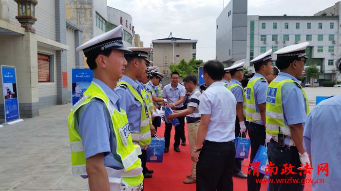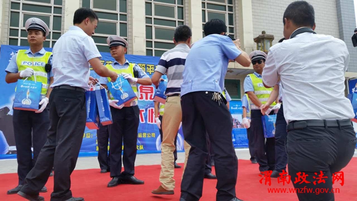 潼关县委宣传部、文明办相关领导、交警大队副大队长刘舍红、华山论剑西凤酒渭南销售公司经理唐辉、潼关县三A购物中心经理王建峰向一线执勤交警发放保温杯、毛巾、太阳伞等礼品;刘舍红带领爱心企业及商家来到各交警执勤点,将绿茶,矿泉水等消暑用品送到一线执勤交警手中。