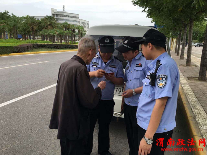 6月15日上午,渭南市公安局高新分局崇业路派出所接一群众报警称:一位老大爷在渭南市崇业路和东风街十字附近转了很久,好像迷路找不到家了,希望得到帮助。值班民警向报警人了解到老人的确切位置后,迅速赶往现场,由于天气炎热、气温较高,民警赶到现场时发现老人神情有些恍惚,通过初步询问,老人说不清楚自己的身份和住处,民警通过老人随身携带的残疾证确认张大爷今年86岁,家住在高新区灵阳村。根据残疾证上提供的详细家庭住址,派出所民警将张大爷安全送回家并亲自交到其家人手中,其家人见到走失的父亲安然无恙,紧紧握住民警的手对派出所的救助再三表示诚挚的感谢。民警对老人家属说:“为群众服务是我们的职责,老人年纪大了,以后要多加留意,不要出什么意外,这是对我们最好的感谢。”
