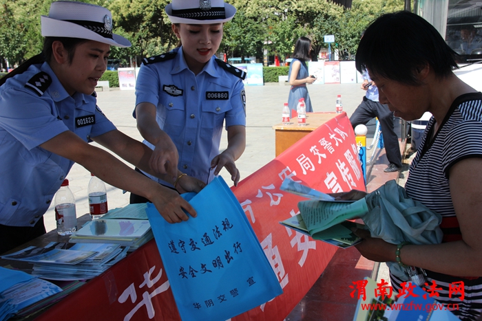 活动中,华阴交警大队组织秩序管理中队、法制督察中队、事故预防处理中队、车管所通过摆放宣传展板、发放宣传资料、展示事故残骸车辆以及接受现场咨询的方式进行交通安全宣传。在活动现场,民警向群众讲解了交通安全法律法规,交通安全常识以及超速、超载、酒驾、闯红灯等违法行为的危害性。增强了辖区广大群众的交通安全意识和自我保护意识。