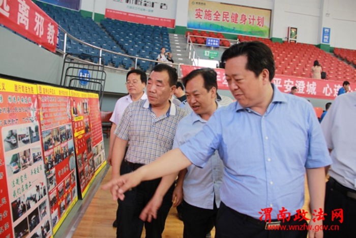 图为市委政法委副书记贾重新、县委书记程军、县人大主任党拴仓、县长白泉朝等领导参观法院工作版面