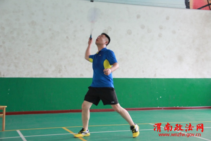 图为赵庄法庭庭长杜宏刚进行羽毛球比赛
