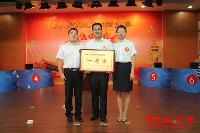 渭南政法网(特约通讯员 赵琳)6月22日上午,渭南市直机关庆祝建党95周年党建党史知识竞赛在中银大厦举行,由周丽君、郑毅、郝举3名同志组成的市委政法委代表队经过激烈角逐,脱颖而出,荣获一等奖。