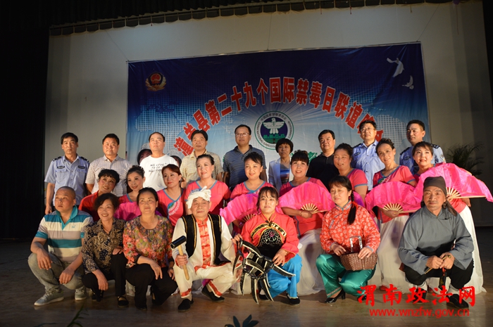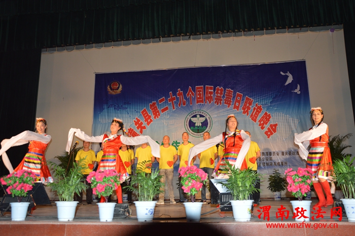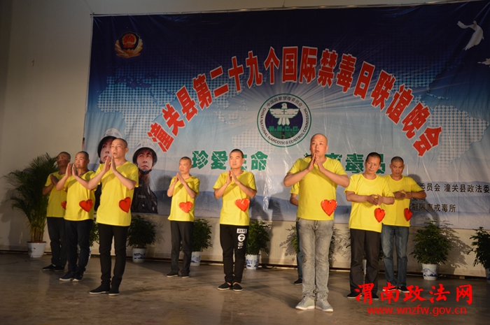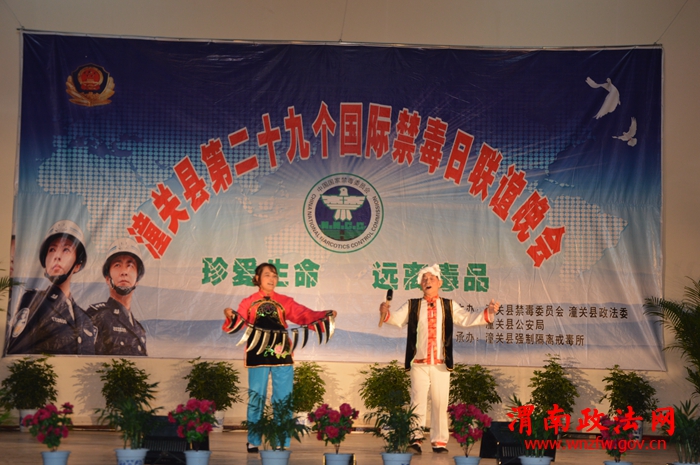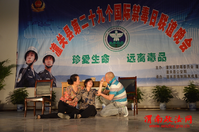 潼关县禁毒联欢晚会演职人员,来自戒毒所、志愿者、戒毒人员,通过自编自演的文艺节目,经常性地进行禁毒、戒毒的宣传教育工作,使广大人民群众加深解毒品对家庭、社会和个人的严重危害。小品《泪洒农家》,观众感触最深:“无毒青春,健康生活”。吸毒不仅是危害个人、家庭的问题,而且也会给社会带来严重的危害。