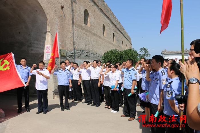 首先,在东仓门外,司法局党员干部整齐列队,面向党旗集体宣誓,重温入党誓词,坚定理想信念,做合格共产党员。