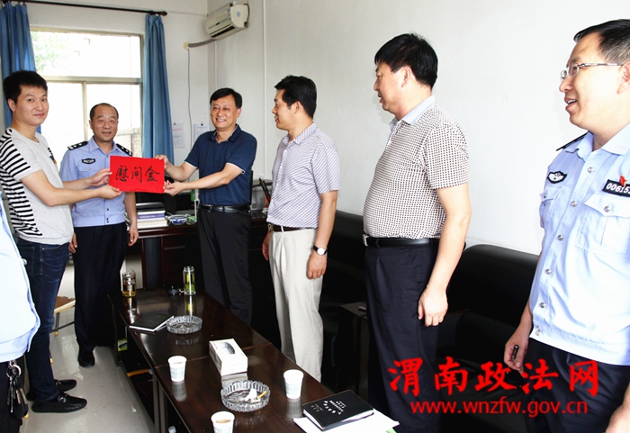 渭南政法网(特约通讯员 刘海滨 杨兆林)7 月12日上午,大荔县公安局局长吴新利和公安纪委书记王宏生以及指挥中心教导员张宇、警务保障室主任董晓强一行来到偏远的韦林派出所,看望战斗在侦查破案 第一线的公安民警。向最近一直顶烈日、冒酷暑昼夜奋战的刑警大队侦查员和派出所民警表示慰问,给成功破获该地区一起系列强奸案的专案组送上慰问金。