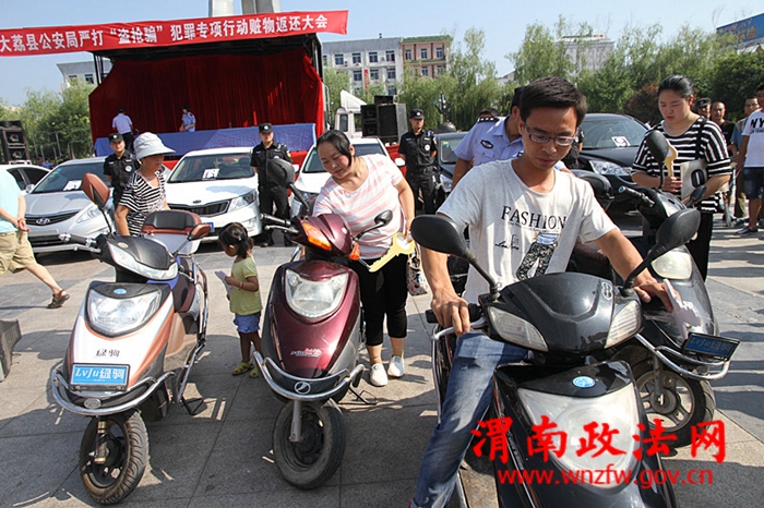 渭南政法网(刘海滨 李晓艳)7月21日,大荔县公安局召开赃物发还会,向社会各界宣布打击“盗抢骗”专项行动战果,将破案追回价值140多万元的被盗物品公开发还失主。