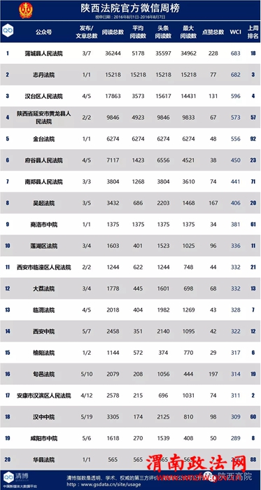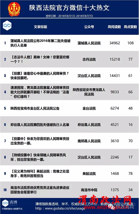 渭南政法网(特约通讯员 李丹)8月9日,陕西省高级人民法院发布的陕西法院微信一周排行榜上(2016年8月1日—2016年8月7日)揭晓了第六期“微信排行榜”,蒲城法院官方微信拔得头筹。这是自第一期以来蒲城法院取得第四名的又一次进步。