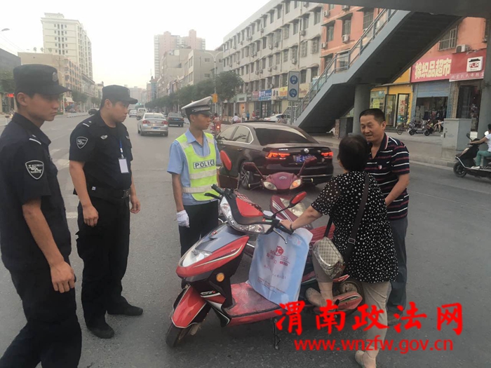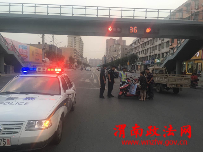 8月9日中午,富平县公安局巡特警大队在南韩大街和金龙大道十字路口巡逻过程中,发现两辆电动车相撞,一辆电动车被撞至路边。情况危急,巡警迅速停车,立即跑到撞车地点进行施救,巡警边救援边迅速拨打120、交警中队电话请求救援。及时疏散围观群众,并迅速在路边设置警示牌,引导交通;疏散围观群众,确保其他过往车辆安全通行。