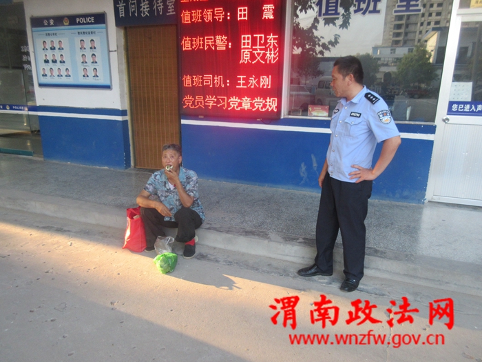 渭南政法网(特约通讯员 闫飞)8月10日下午18时许,一名头发花白的老妇人来到渭南高新白杨派出所,坐在值班室门前的台阶上,嘴里嘟嘟囔囔的说着什么。值班民警上前询问,发现老人讲话语无伦次,前言不搭后语,对于民警的询问,不是拒不回答,就是所答非所问,只是反复念叨自己丈夫不给自己吃饭,自己好饿。