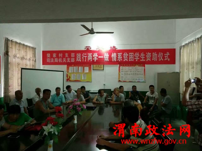 渭南政法网( 特约通讯员 周盈)2016年8月19日,蒲城县司法局机关支部和党睦镇樊家村党支部在樊家村委会举行“践行两学一做,情系贫困学生”资助仪式,为即将入学的贫困大学生送去慰问金。县司法局领导干部、党睦镇包村领导、即将入学的贫困大学生及家长、村委会成员、村民代表等30余人参加。