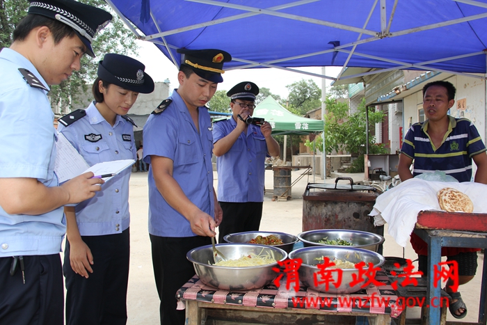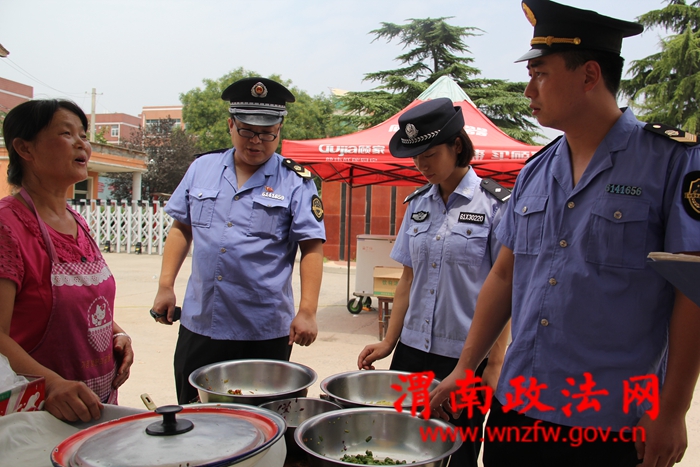 美原派出所联合驻地药监部门正在对美原中学周边饮食小摊点进行检查,并向从业人员进行法律知识宣传。