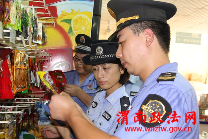 美原派出所联合驻地药监部门正在对美原中学校园超市经营小食品进行检查,并向从业人员进行法律知识宣传。