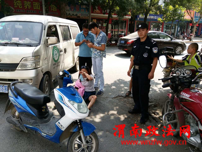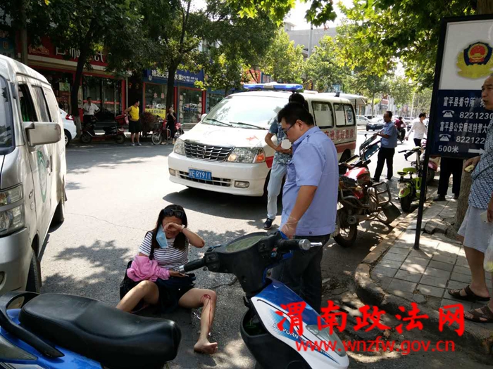渭南政法网(特约通讯员 郎军杰)8月23日,富平县公安局巡特警大队在巡逻过程中,在长顺巷与莲湖大街路口处发生一辆面包车与一辆电动车相撞,导致电动车车主腿部受伤。大队巡逻队员迅速保护现场疏通交通,及时拨打120急救和122交通事故救援电话,将受伤人员抬上救护车。