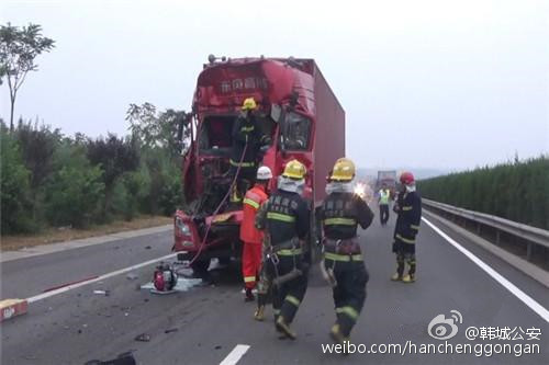 【大货车追尾 韩、合消防联手救援】8月24日,京昆高速合阳往韩城方向一辆大货车发生追尾,一人被困。由于报警人无法说明具体位置。渭南消防支队立即调集韩城消防中队、及合阳消防中队赶赴现场。经过近10分钟的紧张救援,将被困者成功救出。目前,伤者伤情稳定,事故原因交警部门正在调查之中。