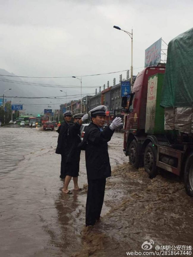华阴交警雨中指挥交通保平安。