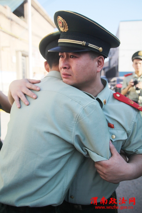 离队之前,中队为退伍老兵举行了简单的送别仪式,几个老兵还凑到跟前把音响调整好。战友相拥的一刹那,他们再也控制不住离别的泪水。说好不哭的赵佳乐开始抱着战友放声大哭,男儿有泪不轻弹,只是未到伤心处,这一刻的眼泪,凝结了退伍老兵对警营的无限眷恋,对战友的衷心祝愿。拍一拍肩膀,道一声珍重。手拉着手依然有说不完的话。当车辆启程,敬起标准的军礼、在悠长的《送战友》中,老兵们慢慢走远。