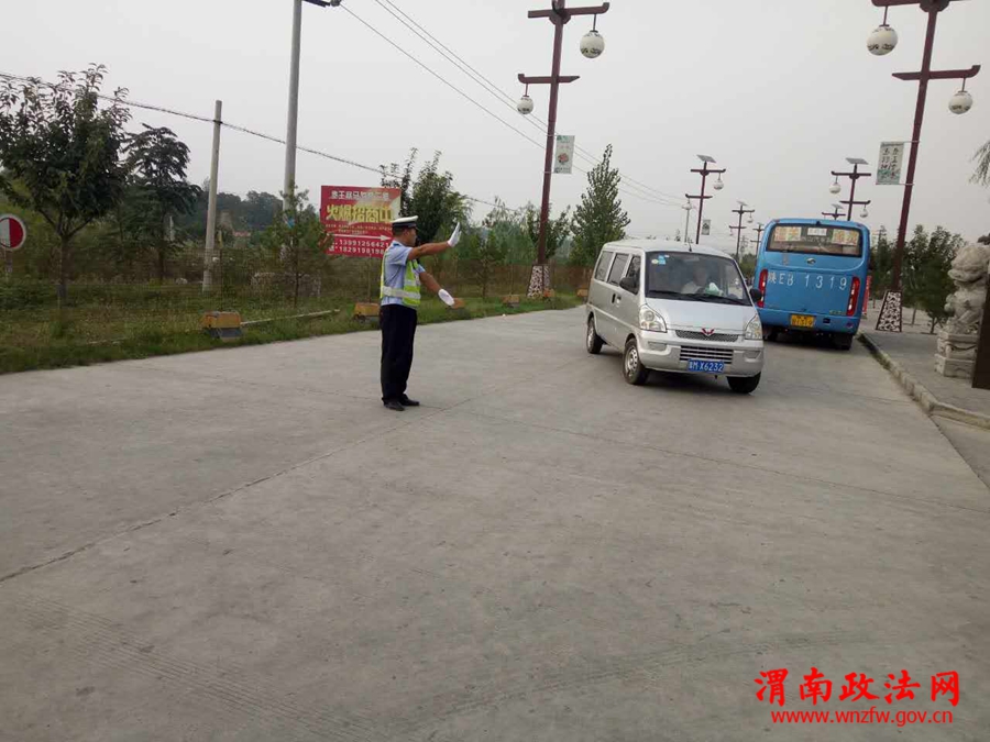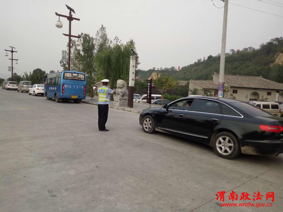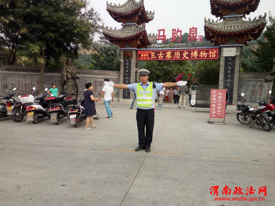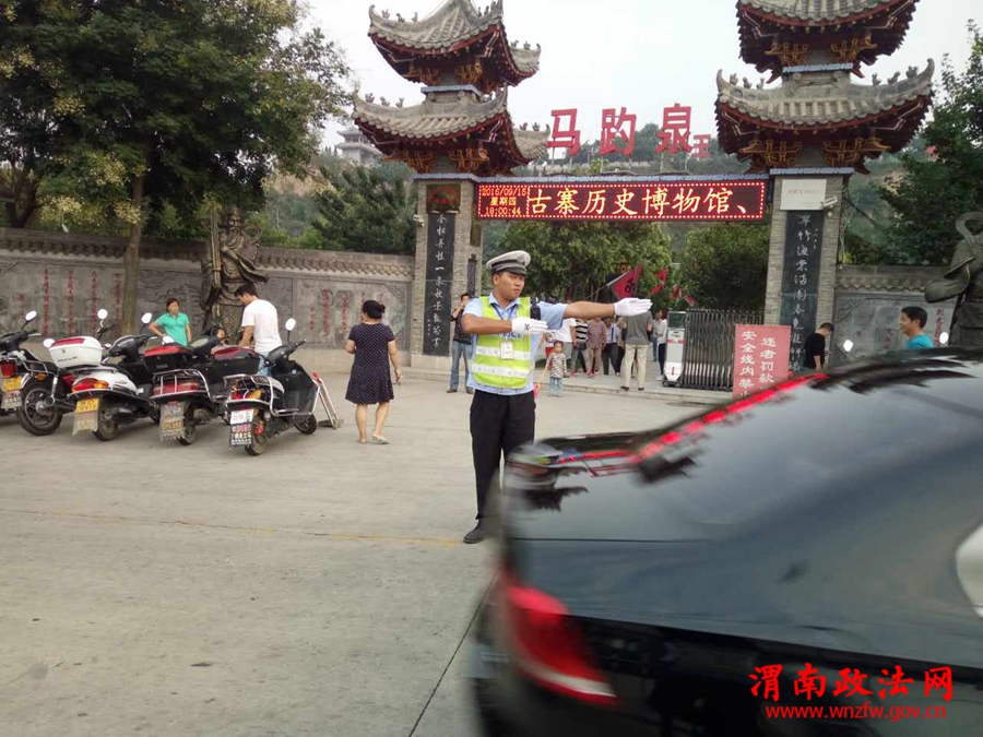 潼关交警矿区中队中队长郭立哲带领中队民警在辖区旅游景点马趵泉路段执勤,安排中队民警在马趵泉门口及停车场门口指挥交通,保障景区路段有序、安全、畅通。