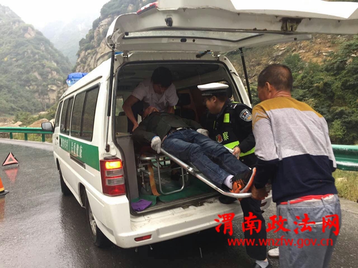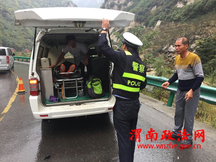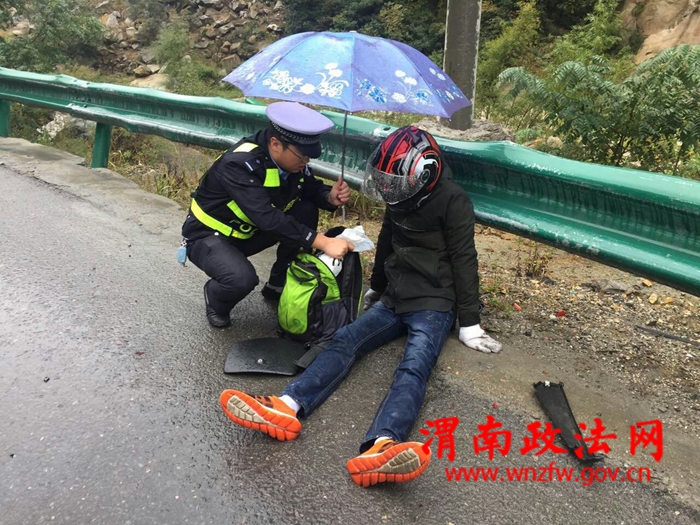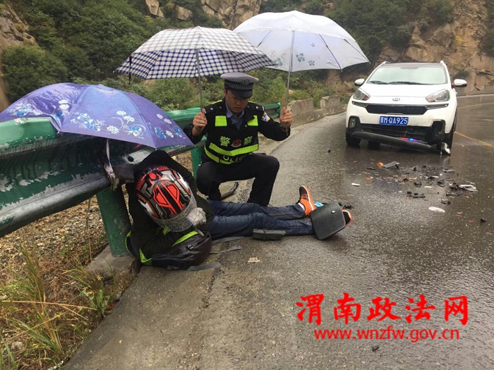 202省道华金公路,是我省一级危险路段,道路依山而建,扶摇直上,对此路段发生的交通事故处置得当,可以有效避免二次交通事故的发生,为此,“十一”期间,华阴交警大队抽调了4名警力驻守我大队罗敷中队,专门负责处置该路段交通事故处置工作。10月5日,事故中队民警接到110指令,202省道华金公路18公里处发生一起交通事故,警情就是警令,接到指令后我大队罗敷事故处理小分队火速赶往事故现场,现场一辆轿车和一辆摩托车发生碰撞,为及时求助伤者,预防二次事故的发生,民警凭借丰富的工作经验,快速果断处置,首先拨打了120急救电话,其次在道路前端、后端500米的路段设置了道路隔离墩,指派专门警力驻守,实行了道路交通管制,这时天空逐渐突然下起了雨,于是民警迅速取出雨伞蹲在雨中为伤者挡雨,待120急救车赶到后,民警帮助医护人员迅速将伤者台上救护车辆,这时停在道路两端的司机朋友在了解情况后也上前帮忙,随后疏导交通秩序,让120救护车辆快速离开,随后民警对事故现场进行了快速的勘查处置后,迅速恢复了道路通行。