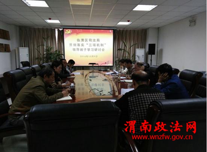 渭南政法网(特约通讯员 宋刚 李瑞 王新荣)10月9日上午,渭南临渭区司法局召开贯彻落实“三项机制”学习研讨会,集中学习省委、市委、区委“三项机制”有关文件,并开展专题讨论。党总支书记白惠莹同志主持会议。
