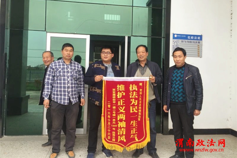 渭南政法网(特约通讯员 樊晓荣)2016年10月26日,一阵鞭炮声打乱了蒲城法院党睦法庭法官干警忙碌的脚步,原来是一位当事人段某远道而来为副庭长杨晓东送来了一面写着“执法为民一身正气 维护正义两袖清风”的锦旗,以表达自己对法官的感激之情。