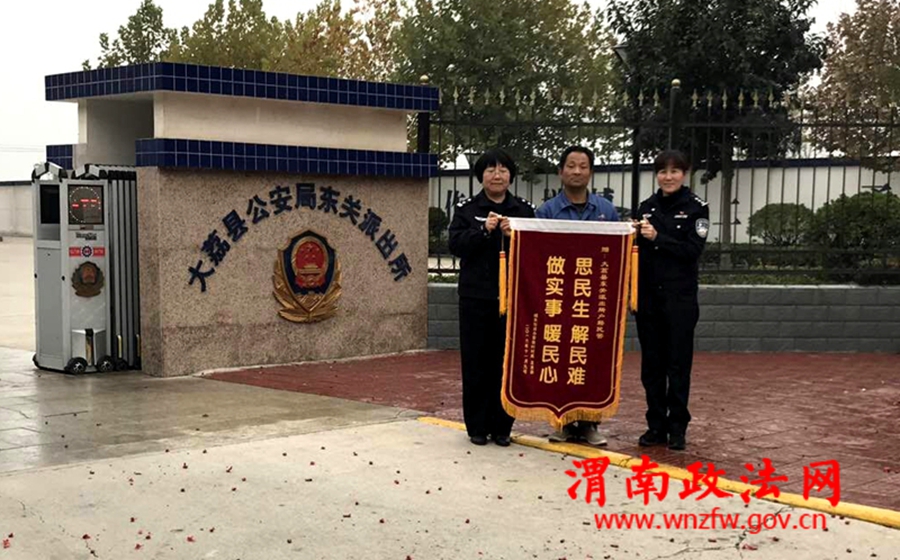 渭南政法网(特约通讯员杨兆林 李晓艳)11月9日一大早,大荔县城关镇高某把一面书写“思民生、解民难、做实事、暖民心”的锦旗送到东关派出所,感谢民警解决女儿落户难题,为户籍民警送上褒奖和谢意。
