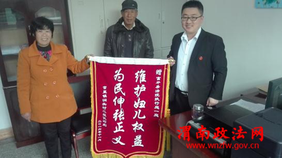 渭南政法网(特约通讯员 王新朝)2016年11月7日一大早,宫里镇涧头村的老仇夫妻将一面印有“维护妇儿权益,为民伸张正义”的锦旗交到富平县法院执行一庭干警冯鹏飞手中,代表在外地打工的女儿仇某某向冯法官道谢,感谢冯法官将被执行人樊某某拖欠多年的孩子抚养费执行回来。