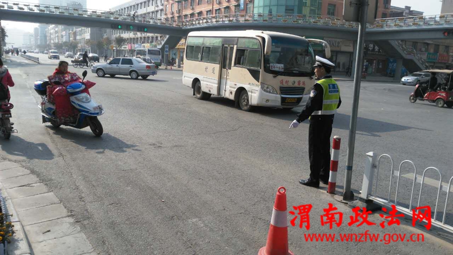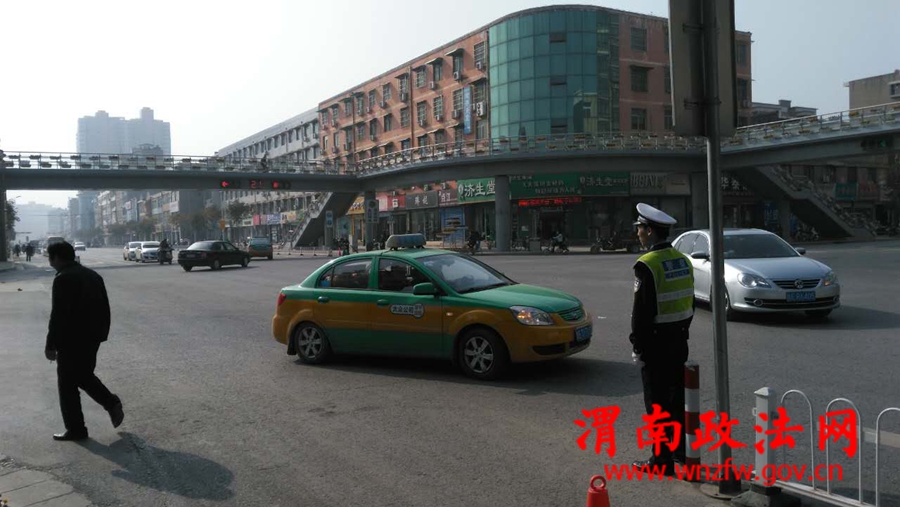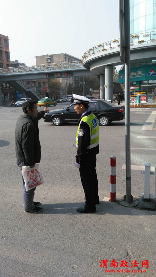 11月15日上午11时,在频阳大道与南韩大街十字天桥附近,交警城区中队民警梁嘉祥正在进行交通劝导活动。