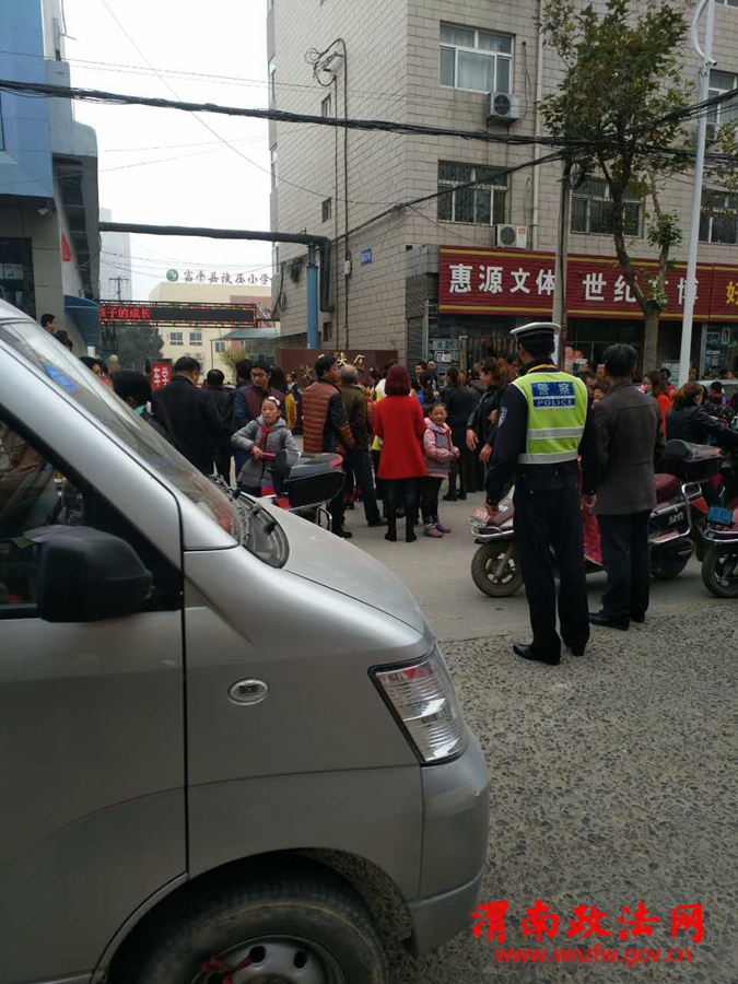 11月18日下午放学时段4时40分许,交警庄里执勤中队陕压小学、庄里小学 “护学岗”执勤民警正在维护校门口交通秩序、疏导交通的情景。