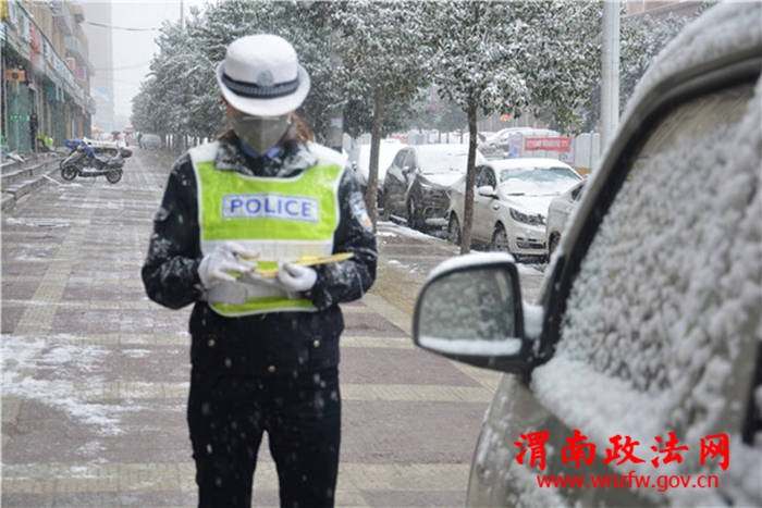 虽然路上风雪交加但一线民警任然坚守在路面,新区东路上指挥中心民警李丹、朱帅红正对沿街路面车辆停放进行整治,保障辖区内无乱停乱放导致交通拥堵。
