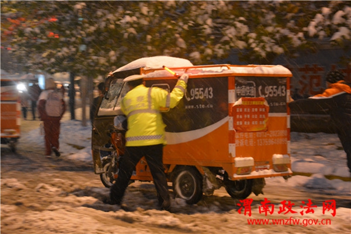 渭南政法网(高新交警讯)11月22日上午下起了入冬以来的第一场雪至晚上8时许,辖区平均积雪已经达到15公分厚,路面上的积雪严重的影响到了人民群众的出行。由于路面积雪导致侧滑、刹车失灵的交通事故频频发生,对人民群众的人身财产安全也造成了极大的隐患。