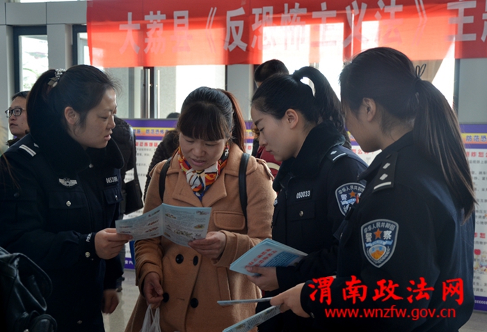 当日上午,大荔县公安局副局长党健和反恐办主任李进军带领民警走进高铁站,向群众发放反恐宣传资料,宣传《反恐怖主义法》。号召群众增强反恐意识,积极提供恐暴犯罪线索,配合公安机关对恐怖暴力犯罪以严厉打击,警民合力保稳定、保平安。活动中,共散发宣传资料1000余份,为群众现场解答释疑200余次。