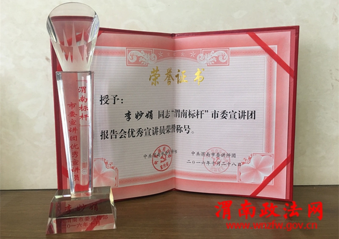 渭南政法网(特约通讯员 惠国强)在渭南市委宣传部开展的以“弘扬社会主义核心价值观,争当标杆,勇创一流”为主题的“渭南标杆”宣讲活动中,蒲城法院城关人民法庭副庭长李妙娟被授予市委宣讲团报告会“优秀宣讲员”荣誉称号。