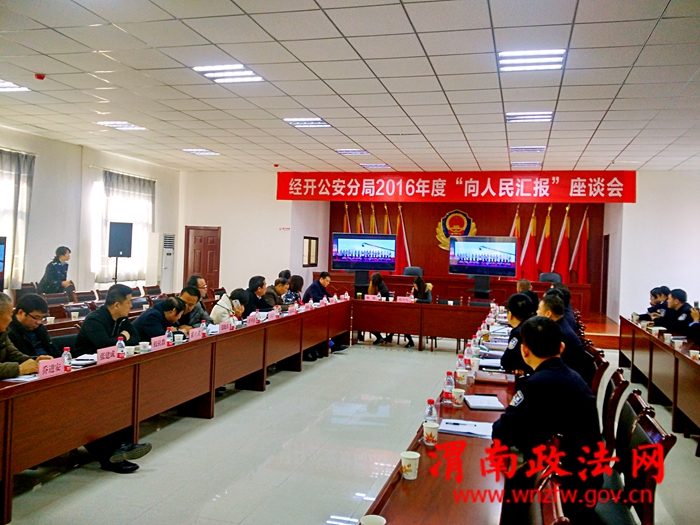 渭南政法网(特约通讯员 刘孟德)12月9日上午,渭南经开公安分局邀请区部分人大代表、政协委员、警风警纪监督员、企业家和群众代表参加了“向人民报告”座谈会。区党工委委员、分局党委书记、局长杨卫军同志出席会议并介绍了2016年的公安工作情况。