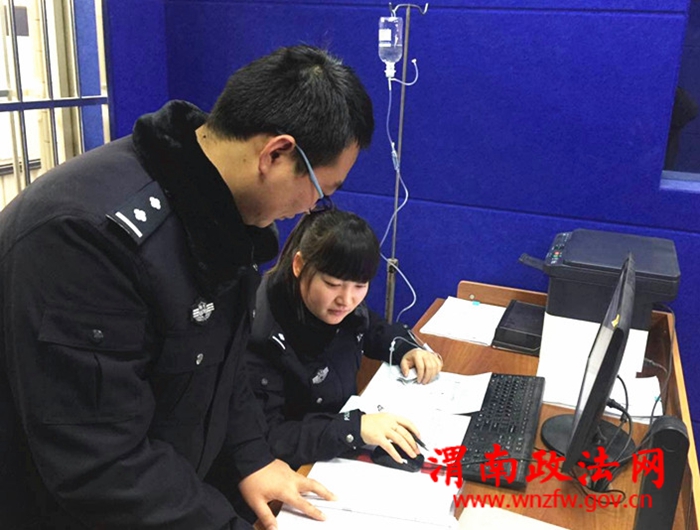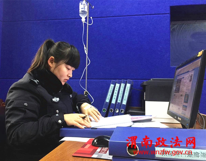 渭南政法网(特约通讯员 刘海滨)12月14日,一幅图片在大荔公安“微信群”出现后不断被刷屏,图上一位女民警打着吊瓶在电脑前办公,引起网友关注。经了解,这个女民警原来是大荔县公安局范家派出所治安内勤张江婷。最近因气候关系她患感冒导致呼吸道感染发烧,医生诊断后让她打吊瓶。可考虑到派出所人少事多“一个萝卜一个坑”,临近年终更是忙得不可开,于是她就在附近诊所扎上吊瓶后回到派出所,一边输液一边忙着准备年终考核和上报治安信息。网友都为这位“吊瓶警花”的敬业精神点赞。