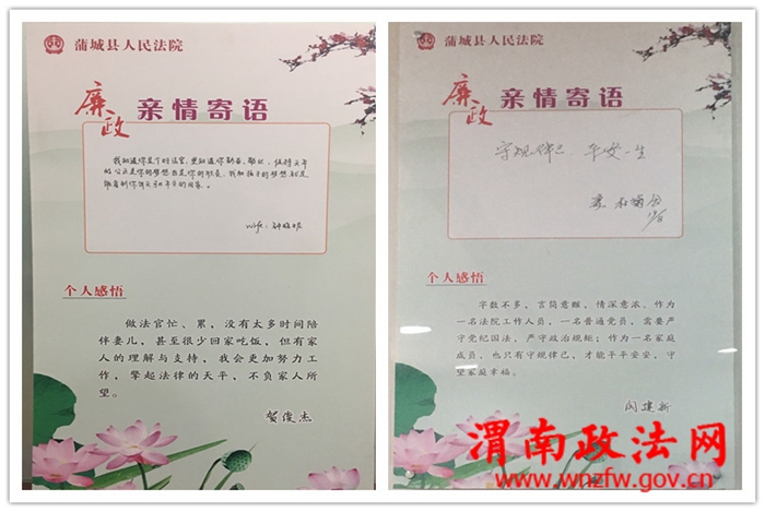 像这样的亲情寄语,在蒲城法院所有干警的办公室墙壁上都能看的到。这些朴实无华的词句都是干警家属亲笔写给干警的廉政寄语。