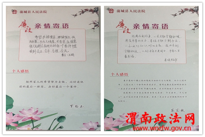 渭南政法网(特约通讯员 惠国强 李丹)为不断创新法院廉政文化建设形式,用丰富多彩的廉政文化启迪思想、陶冶情操、传授知识、鼓舞人心,提高法官干警的司法作风和公正廉洁执法意识,蒲城法院决定推出“家庭助廉、亲情劝廉”的廉政文化形式。