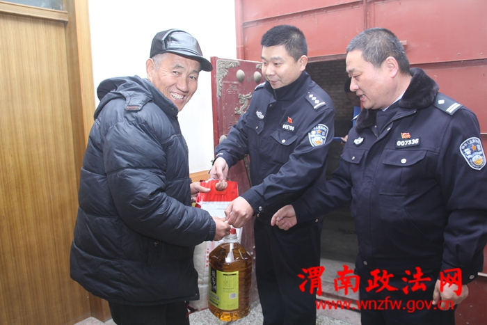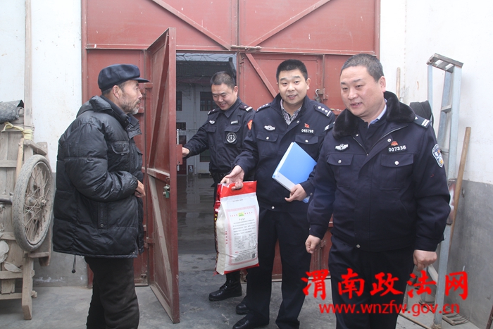 渭南政法网(特约通讯员 郎军杰)元旦、春节将至,为使精准扶贫帮扶对象感受到公安机关的深切关怀,2016年12月20日,富平县公安局巡特警大队一班人带着米、油等慰问品到辖区庄里镇觅子管区园林村送温暖慰问精准扶贫点贫困户。为他们送去了大队的亲切问候和关怀。
