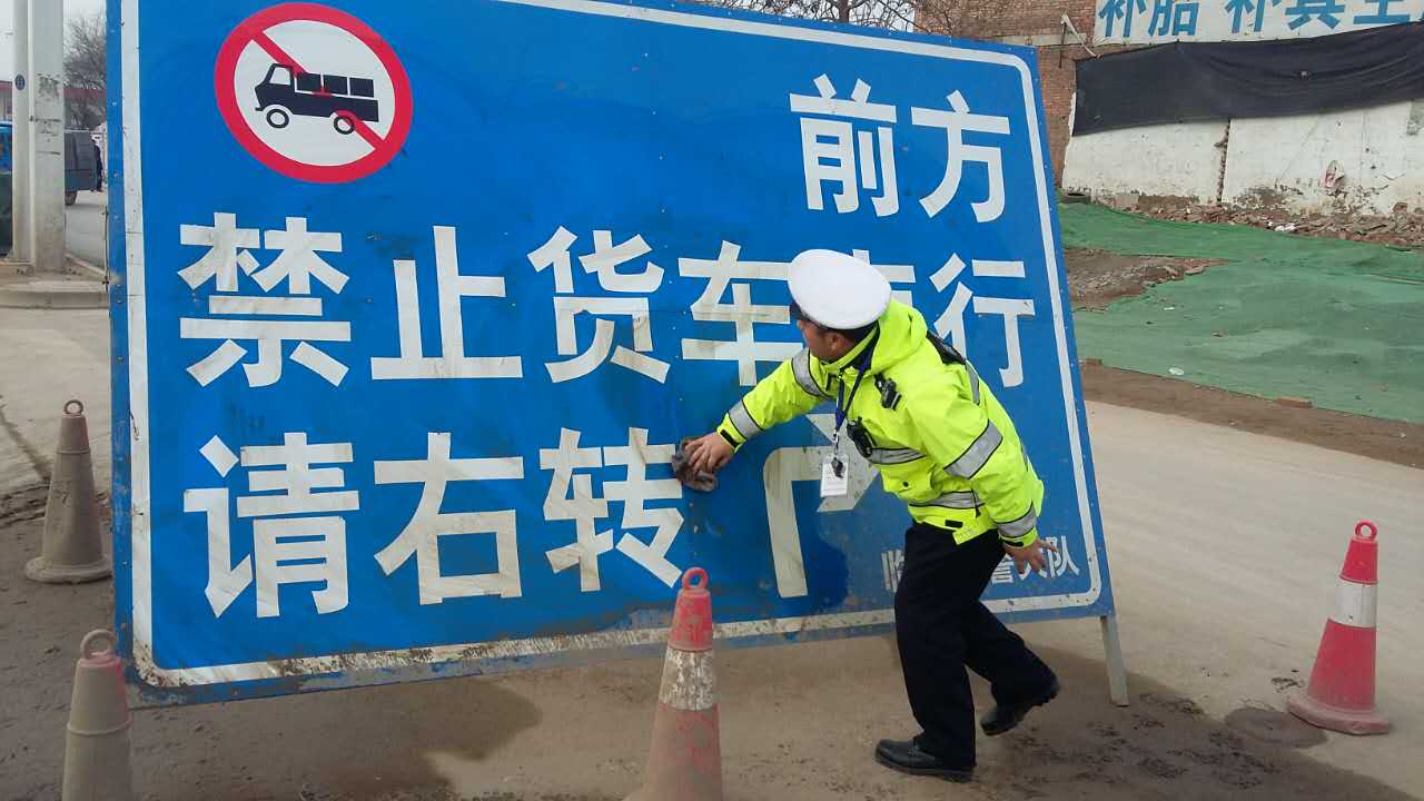 三中队民警在辖区对大货车进行分流时对提示牌做清洗...