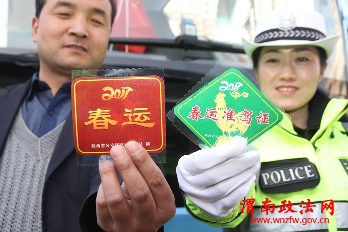 渭南市公安局交警支队临渭大队民警向检、审验合格的客运车辆及驾驶人发放、粘贴 “春运证” 和“春运准驾证”。