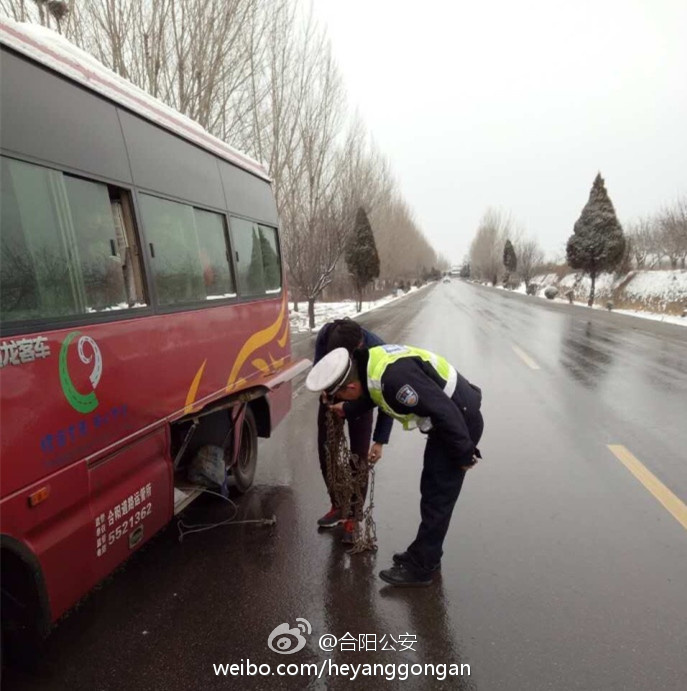 【安全出行】为防止雪后路面湿滑引发交通事故,合阳城区中队民警在黄河路汽车站门口检查出站客车的同时提醒每一位客车驾驶员:请大家减速慢行,谨慎驾驶。民警对车辆的防滑链、三角木等安全设施逐一检查,防患于未然。