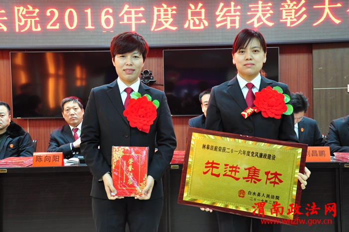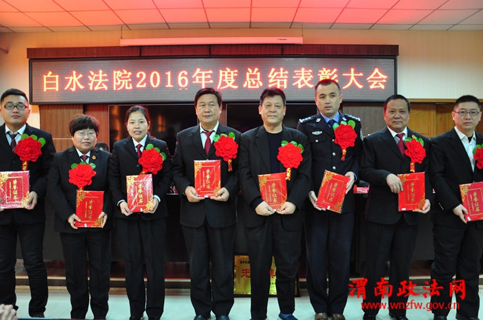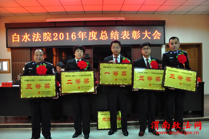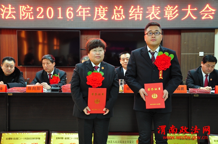 会上该院副院长陈向阳通报了2016年度岗位目标任务考核情况,党组副书记、副院长赵斌龙宣读省市法院和该院的有关表彰决定。为在2016年度各项工作中成绩突出的先进集体、个人,以及受省市法院表彰的办案标兵、集体三等功和个人三等功进行颁奖。