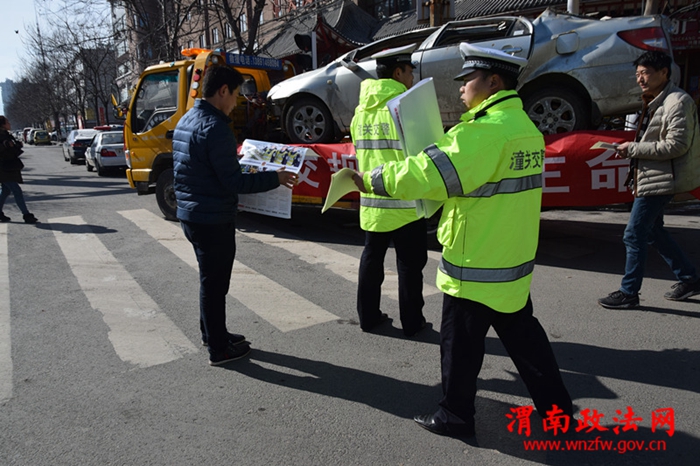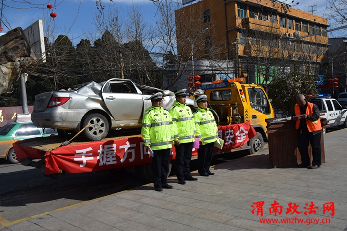 渭南政法网(潼关交警讯) 为警示和教育广大交通参与者遵守交通法规,避免和减少交通事故,近日潼关县交警大队事故中队在城区广场和主要交通路段十字,巡展事故报废车辆,在群众围观的同时,宣传交通安全知识。