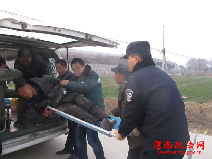 医护人员到达后,民警配合医护人员将伤者抬上救护车并送往县医院接受治疗