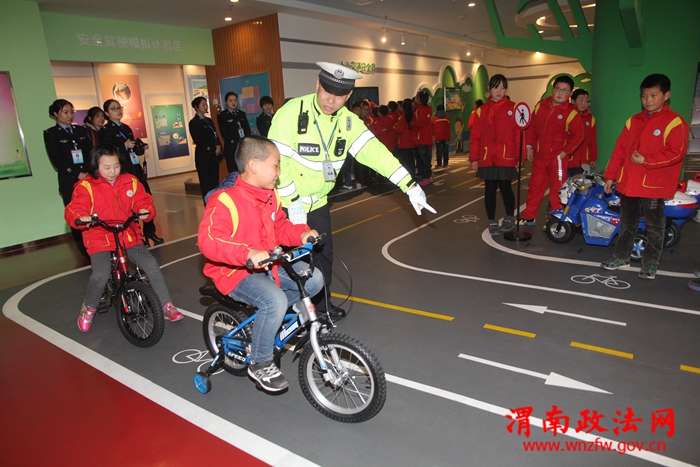 2月15日在渭南市公安局交警支队交通安全宣传教育基地,临渭区育红小学的学生在欢快的气氛中体验、学习交通安全知识。